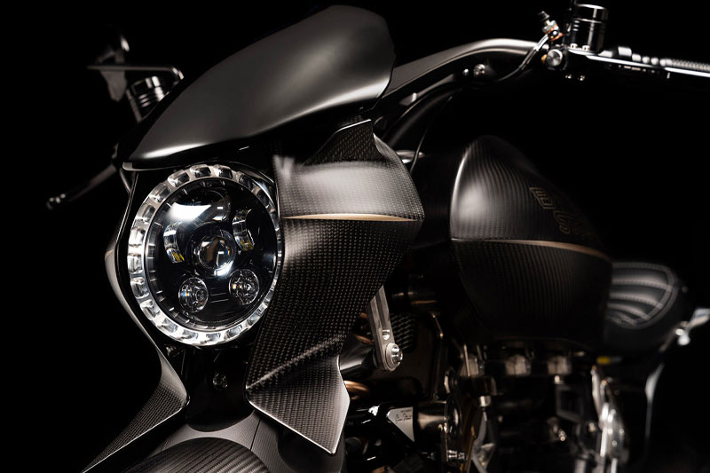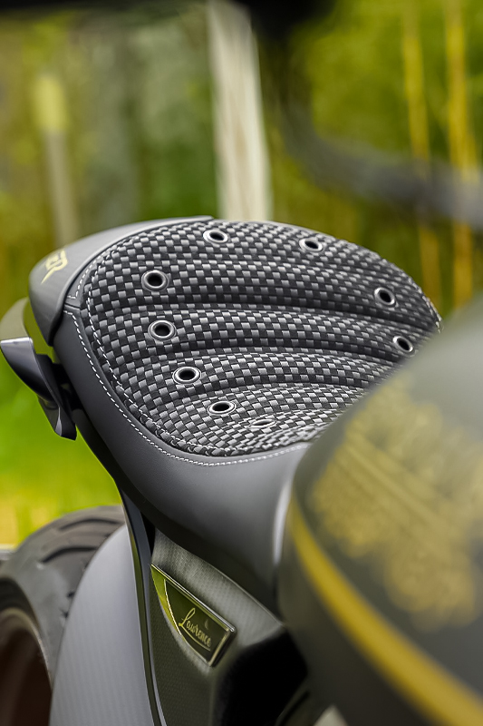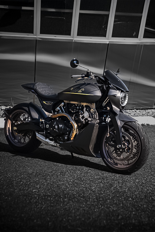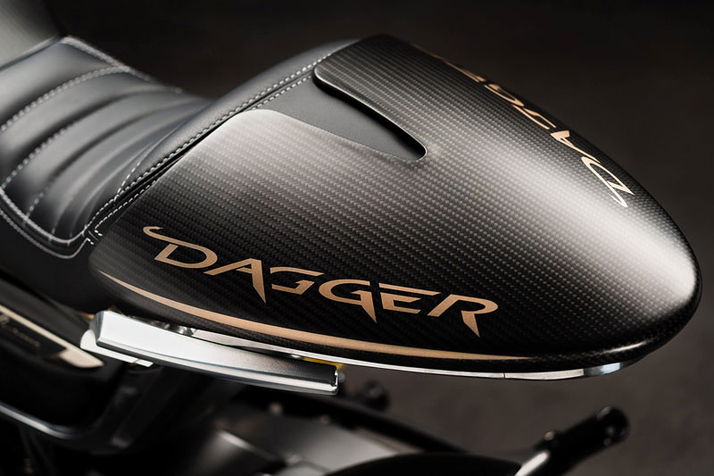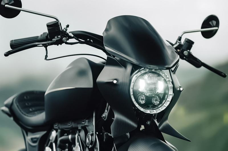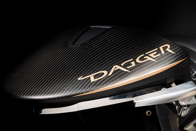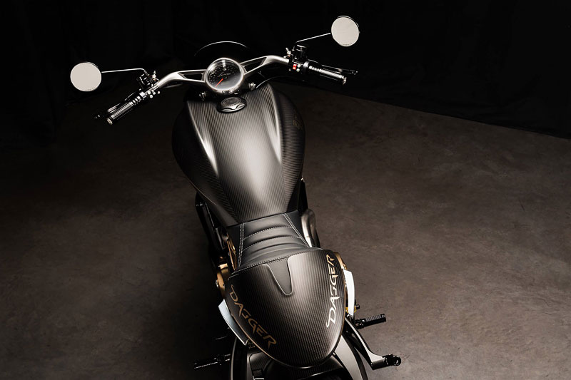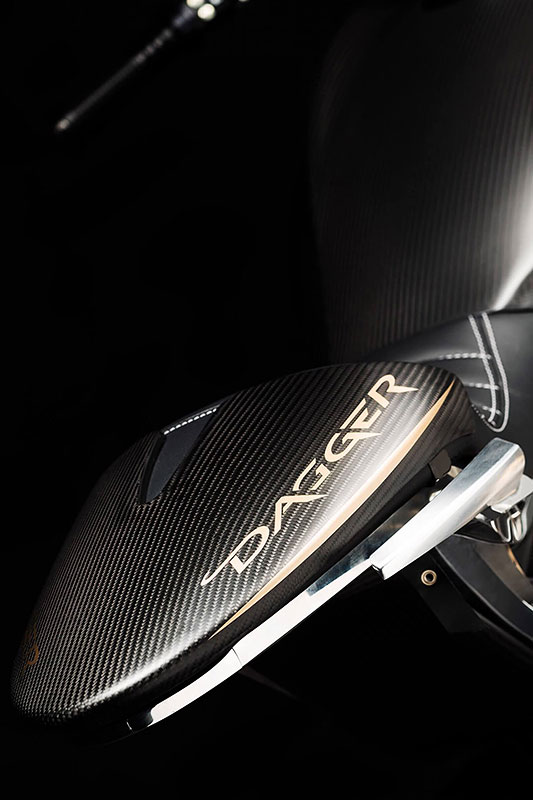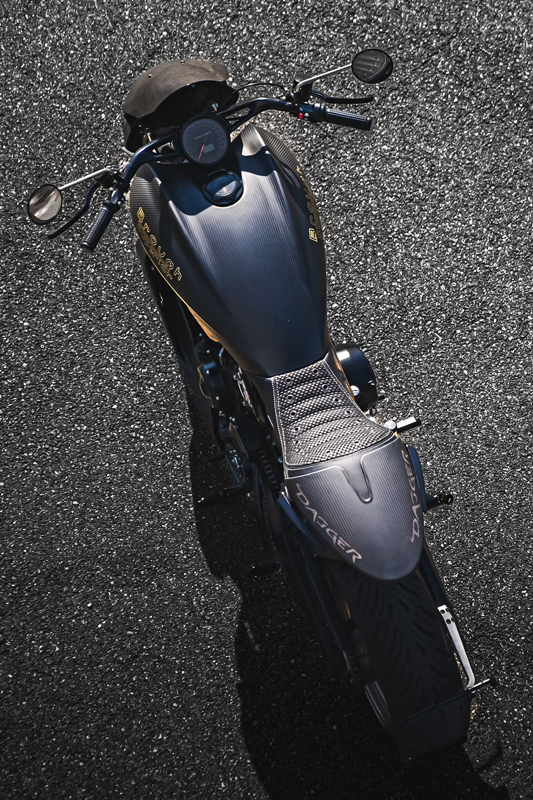 ダガーの造形には、語りすぎることを厭うような抑制の美しさがあります。ただ在る、という静かな構えそのものが、すでに揺るぎない意志の表明であり、ひそやかな挑発のようにも感じられます。全体を貫くのは、研ぎ澄まされた沈黙。その線は直線ではなく、力の流れを内包した曲線で構成されており、そこには物理よりも情念に近い輪郭が浮かび上がります。フロントマスクは、円形のヘッドライトを中心に据え、すっと前方に絞り込まれるノーズコーンによって、静けさの中に俊敏さを予感させます。空気を切るのではなく、空気と和することを選んだかのようなその表情からは、対話を志す姿勢が滲み出ています。最新の技術、CNC加工によるアルミパーツの精密なディテールには、手のひらに伝わる冷たさまで想起させる緊密さがあります。車輌を覆うのは、カーボンファイバー。それは飾りではなく、軽さのためだけでもありません。織り込まれたその繊維が語りかけてくるのは、素材そのものが宿す沈黙の力であり、無垢な剛性、そして構造としての祈りです。深く艶を抑えた黒が車輌全体を支配し、その闇の中にひっそりと浮かぶゴールドのアクセントが、控えめであるがゆえに、なおさら深い余韻を残します。排気系は、2本出しという誇張を捨て、車輌下方に収束された2 in 1の構成。静けさを伴う力。それは雄叫びではなく、低く深く鳴る唸りとなって車輌の芯を貫きます。その音ですら構造の一部として緻密に設計されており、走行中にはライダーの思考と音が並走するような一体感が生まれます。ハンドルの位置は低すぎず、高すぎず、絶妙な高さに設定されています。意図された前傾姿勢は、無理なく意識を前方へ導き、走行のためだけでなく、精神のあり方としての謙虚さを含んでいるようです。足元のステップやリンク類にいたるまで、一切の無駄がありません。削り出された各パーツはすべて、機能と造形を等しく備え、冷たさのなかに静かな熱を宿しています。テールエンドは、突き詰められた抑揚の中で、まるで最後の一筆のように鋭く収束。シングルシートカウルがその終端を際立たせ、座面に彫り込まれた「Dagger(ダガー)」の文字は、紋章のようにこの車輌の精神を刻みます。確かに存在する静かな刃としての姿が、見る者の心の奥に語りかけてきます。ダガーとは、かたちではなく、構えそのものなのかもしれません。その佇まいに心惹かれたとき、すでに言葉を交わすことなく、何かが通じ合っているのでしょう。美は主張せずとも、揺るぎなく佇みます。