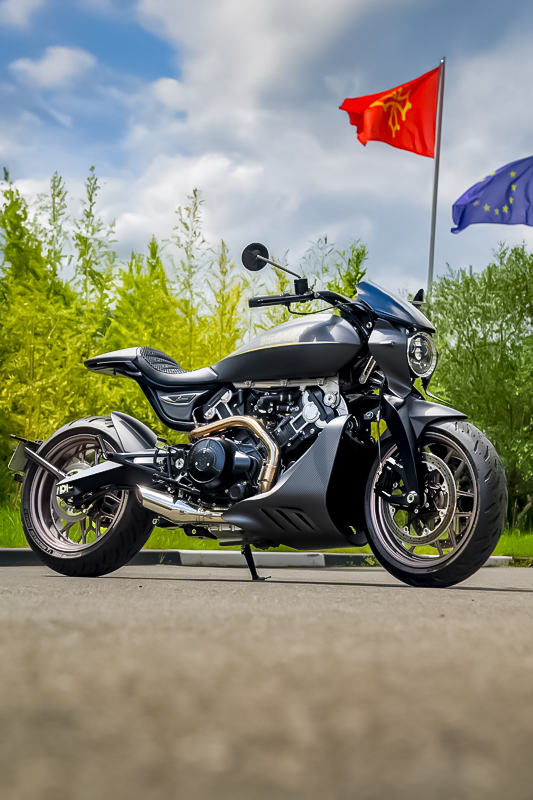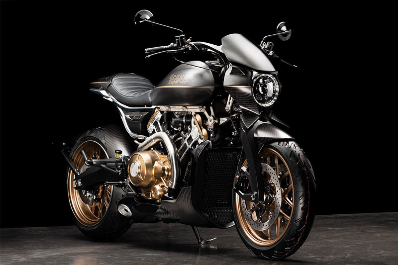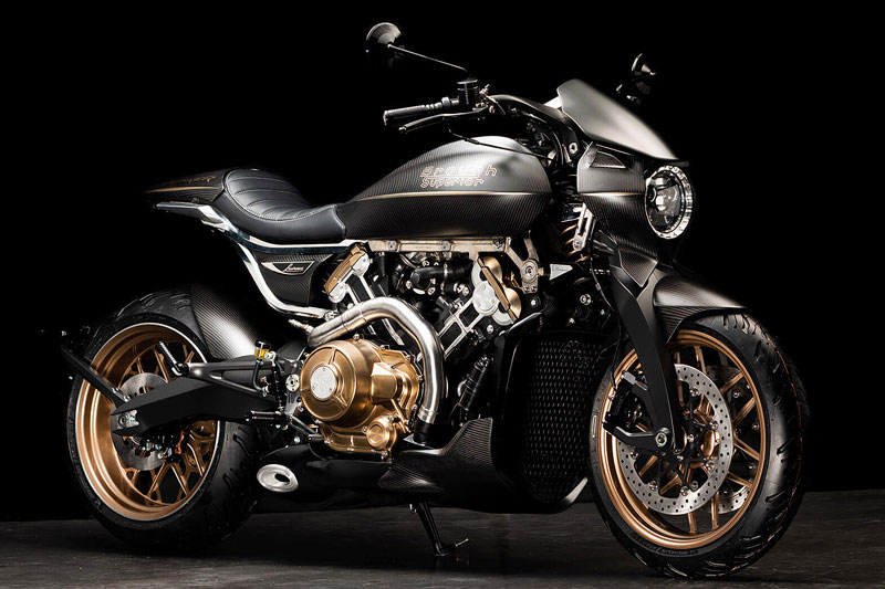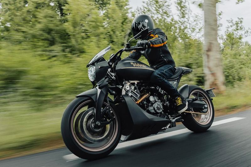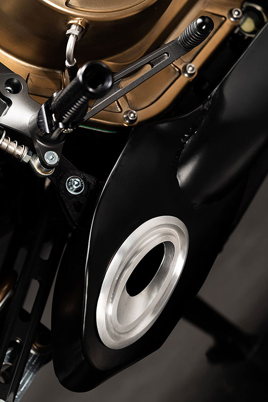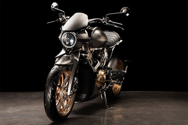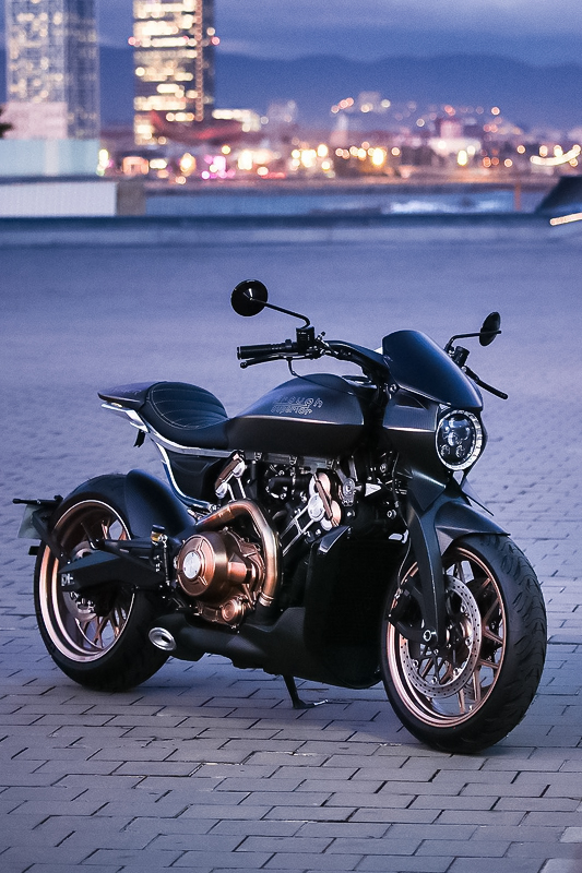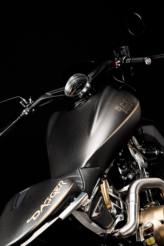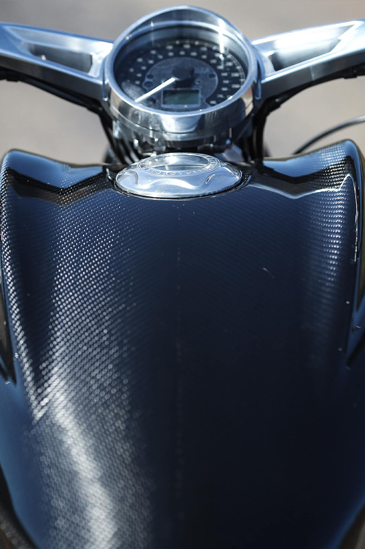 ダガーの造形には、語りすぎることを厭うような抑制の美しさがあります。ただ在る、という静かな構えそのものが、すでに揺るぎない意志の表明であり、ひそやかな挑発のようにも感じられます。全体を貫くのは、研ぎ澄まされた沈黙。その線は直線ではなく、力の流れを内包した曲線で構成されており、そこには物理よりも情念に近い輪郭が浮かび上がります。フロントマスクは、円形のヘッドライトを中心に据え、すっと前方に絞り込まれるノーズコーンによって、静けさの中に俊敏さを予感させます。空気を切るのではなく、空気と和することを選んだかのようなその表情からは、対話を志す姿勢が滲み出ています。最新の技術、CNC加工によるアルミパーツの精密なディテールには、手のひらに伝わる冷たさまで想起させる緊密さがあります。車輌を覆うのは、カーボンファイバー。それは飾りではなく、軽さのためだけでもありません。織り込まれたその繊維が語りかけてくるのは、素材そのものが宿す沈黙の力であり、無垢な剛性、そして構造としての祈りです。深く艶を抑えた黒が車輌全体を支配し、その闇の中にひっそりと浮かぶゴールドのアクセントが、控えめであるがゆえに、なおさら深い余韻を残します。排気系は、2本出しという誇張を捨て、車輌下方に収束された2 in 1の構成。静けさを伴う力。それは雄叫びではなく、低く深く鳴る唸りとなって車輌の芯を貫きます。その音ですら構造の一部として緻密に設計されており、走行中にはライダーの思考と音が並走するような一体感が生まれます。ハンドルの位置は低すぎず、高すぎず、絶妙な高さに設定されています。意図された前傾姿勢は、無理なく意識を前方へ導き、走行のためだけでなく、精神のあり方としての謙虚さを含んでいるようです。足元のステップやリンク類にいたるまで、一切の無駄がありません。削り出された各パーツはすべて、機能と造形を等しく備え、冷たさのなかに静かな熱を宿しています。テールエンドは、突き詰められた抑揚の中で、まるで最後の一筆のように鋭く収束。シングルシートカウルがその終端を際立たせ、座面に彫り込まれた「Dagger(ダガー)」の文字は、紋章のようにこの車輌の精神を刻みます。確かに存在する静かな刃としての姿が、見る者の心の奥に語りかけてきます。ダガーとは、かたちではなく、構えそのものなのかもしれません。その佇まいに心惹かれたとき、すでに言葉を交わすことなく、何かが通じ合っているのでしょう。美は主張せずとも、揺るぎなく佇みます。