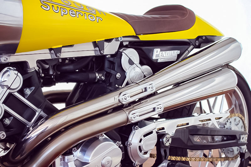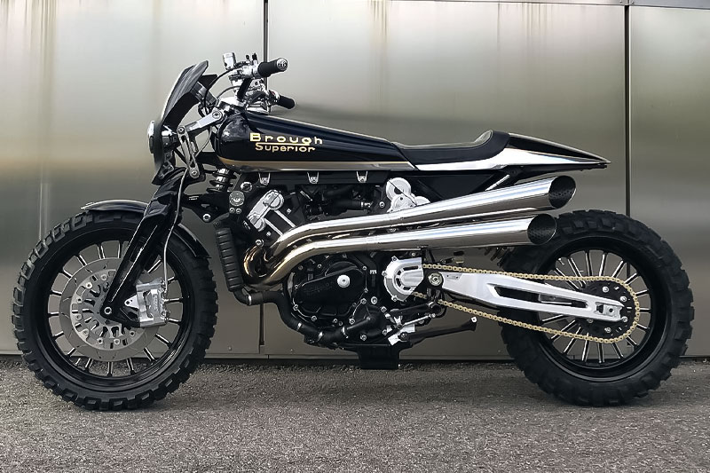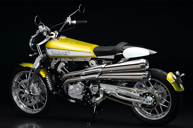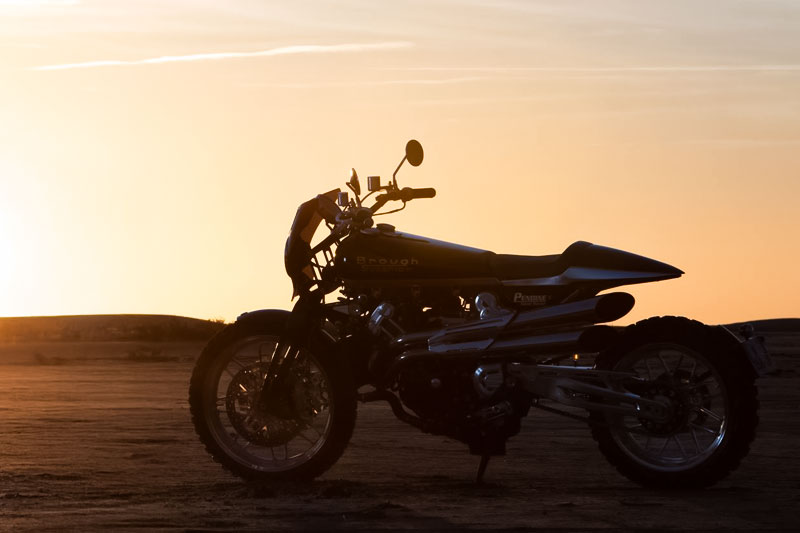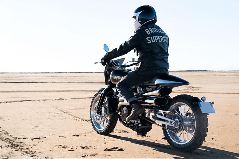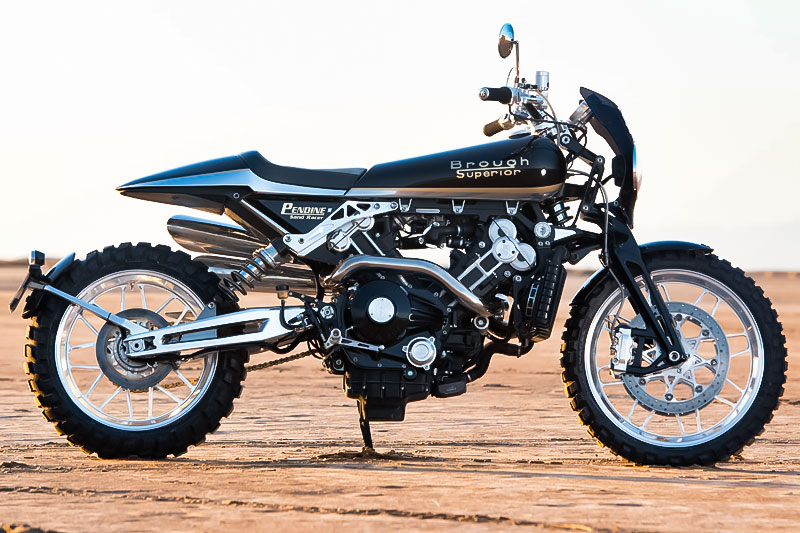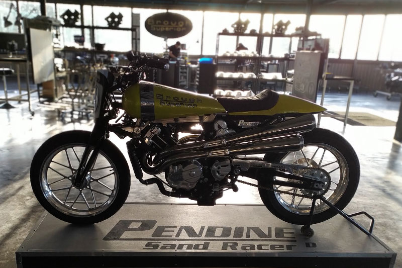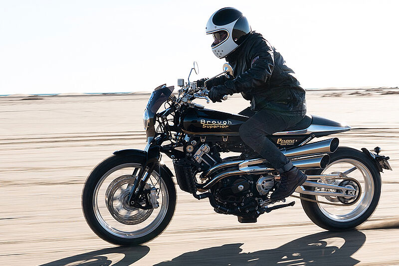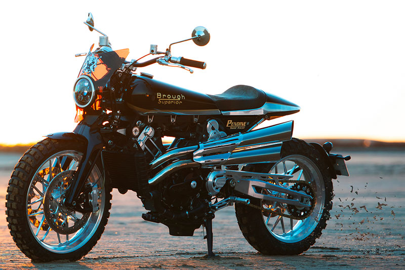 ウェールズ南西部の海岸に広がるペンディン サンド(Pendine Sands)は、干潮時におよそ11キロメートルもの平坦で硬質な浜が現れ、自然が用意した直線のテストトラックとして知られています。1920年代、この地はスピード記録の聖地としてその名を轟かせ、四輪ではマルコム キャンベルが150mphの壁を破り、パリー トーマスが命を懸けて時速270kmを超える挑戦に臨みました。一方、モーターサイクルの世界でもペンディン サンドは重要な舞台となりました。1922年からは「ウェルシュTT(Welsh Tourist Trophy)」が開催され、モーターサイクルもまたこの地で砂を蹴り、風を裂きました。1927年には、ジョージ ブラフが自身のS.S.100で130.6mph(約210km/h)を記録し、当時のソロモーターサイクルとして世界最速の記録を樹立しました。その後も、ペンディン サンドは時代の最先端を走る者たちにとって特別な場所であり続けます。2018年にはゼフ アイゼンバーグがハヤブサを改造したマシンで時速320kmを突破し、モーターサイクルによる記録を更新しています。そんな場所に、ふたたびブラフシューペリアの名が響きます。ブランドがその精神と遺伝子を受け継ぎ現代に放つマシン、それがペンディン サンドレーサー。歴史への敬意と革新への情熱とを一身に背負い、時空を越えて甦ったこのモデルは、ただ速さを追い求めるだけでなく、挑戦することの尊さまでも体現。外観には、砂の記憶を纏ったような力強さと洗練が共存。高く跳ね上がったエキゾースト、幅広で剛性あるハンドルバー、そして精巧なアルミニウム製のタンクとシートユニット。光が触れるたび、シートユニットの造形が繊細な陰影をまとい、静謐な緊張感を生み出します。搭載されるのは、997cc 水冷DOHC 88度V型2気筒エンジン。最高出力102馬力、最大トルク87Nmを発揮し、未舗装の路面でも力強く、粘りのあるトルクを供給します。フレームには軽量かつ高剛性なチタン合金を採用し、Fior式ダブルウィッシュボーン フロントサスペンションが操縦安定性と俊敏な応答を両立します。ブレーキには、バルリンガー製のディスクを前後に装備。フロント19インチ、リア17インチのCNC削り出しホイールとともに、路面との対話を深める精密な足まわりを実現。フランス トゥールーズの工房にて、一台一台が熟練職人の手によってビスポークで仕立てられます。このモーターサイクルは歴史と革新が融合した芸術作品。所有する者の感性と哲学が反映され、走ることでその真価を発揮します。