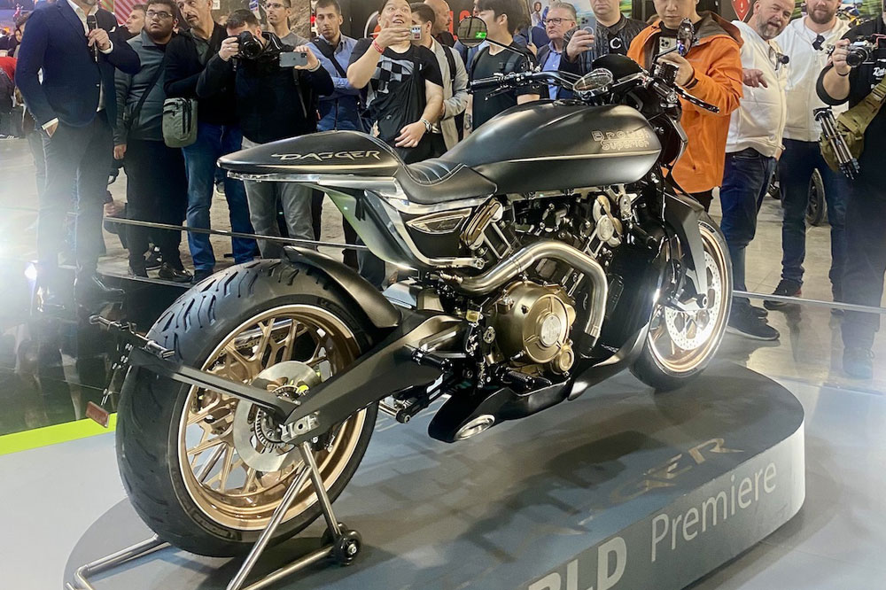ブース内には他のモデルも多数展示されており、ブランドの現代的展開が来場者に紹介されました。その中には、ブラフ シューペリアの現代復興を象徴するオリジナルの「S.S.100」、新型ダガーのベースとなった「ロレンス」、冒険の旅を想定して設計された「ネフッド」が含まれていました。また、「ゴールデン ドリーム」カラーのアニバーサリーモデルや、「ペンディン」が2台展示され、クラシックと現代、両方の側面を感じさせる構成となっていました。